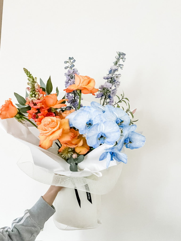 Flowers: roses, snapdragon with trailing dyed orchid and seasonal blooms.